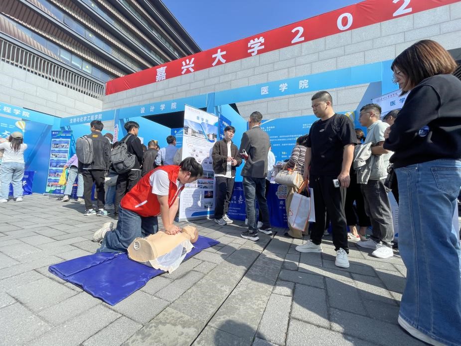 “手臂要伸直,用上半身的力量垂直下压……”在医学专业志愿者手把手的指导下,多位家长和考生轮流上前,在急救模拟人上认真练习起心肺复苏术。边操作边提问,从按压手法、节奏到人工呼吸要领,不少人很快掌握了基本技巧。原本的招生咨询区,转眼化身为一场生动的“迷你急救公开课”。